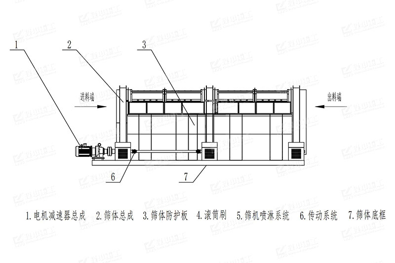 滾筒裝置傾斜安裝于機架上。電動機經(jīng)減速機與滾筒裝置通過聯(lián)軸器連接在一起,驅(qū)動滾筒裝置繞其軸線轉(zhuǎn)動。當物料進入滾筒裝置后,由于滾筒裝置的傾斜與轉(zhuǎn)動,使篩面上的物料翻轉(zhuǎn)與滾動,使合格物料(篩下產(chǎn)品)經(jīng)滾筒外圓的篩網(wǎng)排出,不合格的物料(篩上產(chǎn)品)經(jīng)滾筒末端排出。 在滾動過程中位于篩子上部的拍打架會一直拍打滾筒裝置,防止物料卡在篩網(wǎng)中影響篩子使用。同時滾筒篩的噴淋可以在滾筒裝置轉(zhuǎn)動過程中對篩子表面及物料進行沖洗,是物料更干凈。
