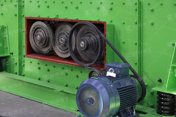 三軸橢圓篩的激振器是由三根并列的振動(dòng)軸組成,位于篩箱一側(cè)的振動(dòng)軸的一端裝有速比為1的互相嚙合的三個(gè)齒輪; 振動(dòng)篩工作時(shí),電機(jī)皮帶傳動(dòng)裝置帶動(dòng)激振器的三個(gè)齒輪旋轉(zhuǎn),由于三根軸上均裝有相等的偏心質(zhì)量、相同的偏心半徑的配重盤(pán),由等參數(shù)的齒輪同步連接,因此篩箱的運(yùn)動(dòng)軌跡呈現(xiàn)為橢圓形,即單軸振動(dòng)篩的圓運(yùn)動(dòng)軌跡和雙軸振動(dòng)篩的直線運(yùn)動(dòng)軌跡的合成運(yùn)動(dòng)軌跡。橢圓的運(yùn)動(dòng)軌跡可以使物料擁有更大的運(yùn)行速度,提高設(shè)備的產(chǎn)量。