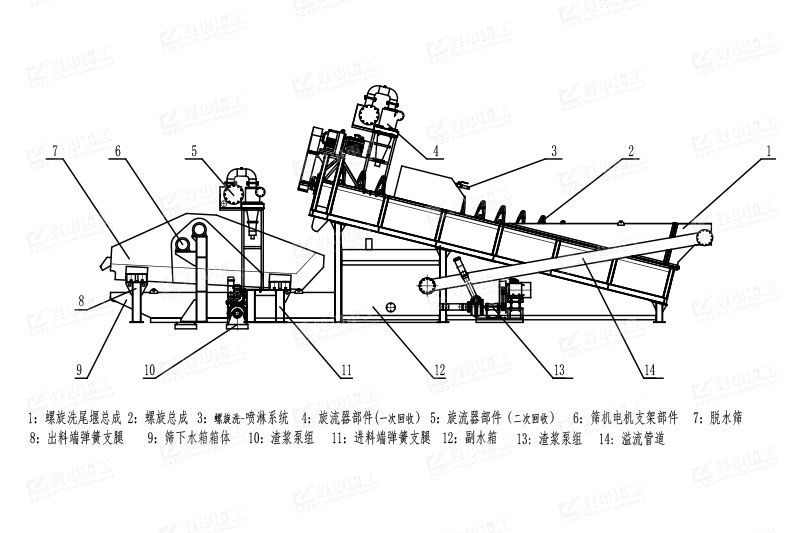 結(jié)構(gòu)設(shè)置合理,采用尾礦干排篩配合螺旋洗砂機(jī)設(shè)置,形成整體結(jié)構(gòu),篩分和清洗結(jié)合在一起,易于生產(chǎn)加工,生產(chǎn)周期短,占地面積小,處理能力大,同時采用渣漿泵和旋流器連通在一起,形成水體的回流,節(jié)約水體消耗,能夠更好的進(jìn)行篩分和清洗,促進(jìn)篩洗行業(yè)的發(fā)展。