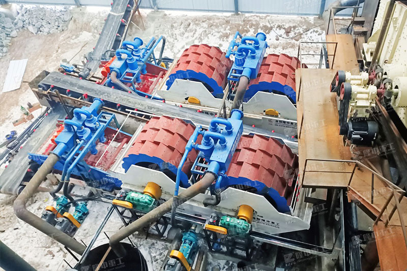 經(jīng)過前期處理過后的物料進(jìn)入儲(chǔ)水槽中,洗沙輪通過電機(jī)與減速機(jī)開始轉(zhuǎn)動(dòng),將儲(chǔ)水槽中的物料從水中撈起并通過洗沙輪中的網(wǎng)孔將水與低于網(wǎng)孔大小的物料漏掉,將合格的物料轉(zhuǎn)移到第二個(gè)儲(chǔ)水槽中,在洗沙輪的轉(zhuǎn)動(dòng)過程中物料與水充分接觸,利用水帶走物料表面的雜志,是物料更干凈。然后第二個(gè)洗砂輪再重復(fù)前部洗沙輪的過程,對(duì)物料再進(jìn)行二次清洗。 清洗完成的物料進(jìn)入后端脫水裝置,通過脫水裝置的振動(dòng)將大量水分除掉,使物料更方便儲(chǔ)存與運(yùn)輸。對(duì)于在儲(chǔ)水槽中漏掉的物料經(jīng)過溢流裝置進(jìn)入機(jī)器末端的抽水槽,由水泵抽到分離回收裝置中進(jìn)行濃縮回收,濃縮之后合格的物料再返回脫水裝置中進(jìn)行脫水收集。多余的廢水雜質(zhì)進(jìn)入返水箱排出。