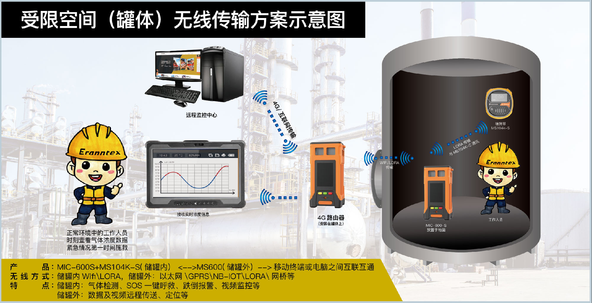 作業(yè)中,監(jiān)測主機(jī)在受限空間外。施工工人佩戴一臺便攜式檢測儀PTM600-S進(jìn)行作業(yè),隨時(shí)檢測所處環(huán)境的氣體濃度狀況,外邊監(jiān)護(hù)人員可通過手機(jī)或ipad進(jìn)行查看監(jiān)測數(shù)據(jù)。必要時(shí),可在內(nèi)部增加中繼設(shè)備延長傳輸距離。